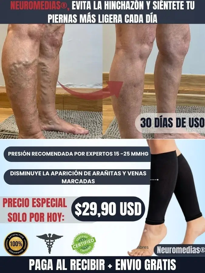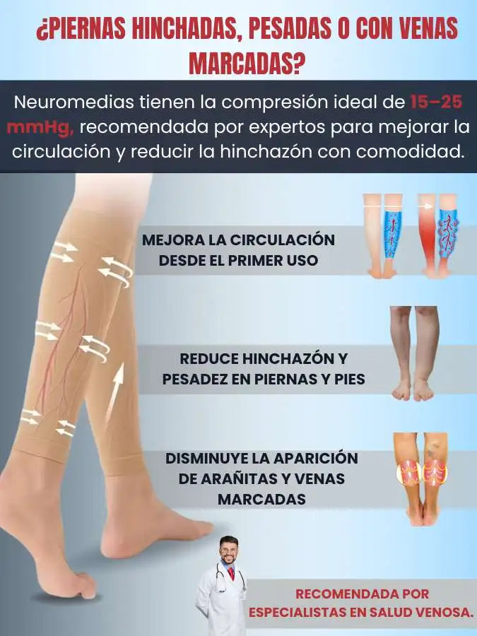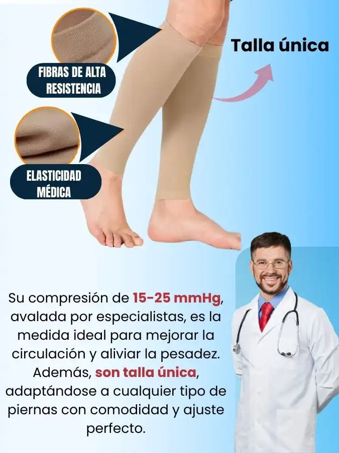 Estas no son medias comunes, son medias de compresión médica graduada (15–25 mmHg), la presión recomendada por especialistas para mejorar la circulación. Ayudan a reducir hinchazón, pesadez y prevenir complicaciones en las venas.