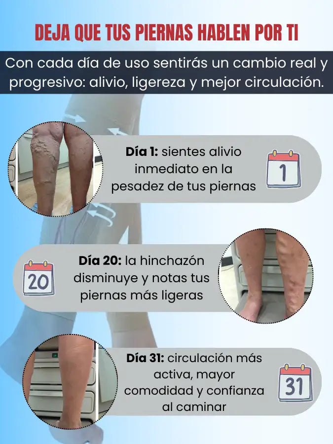 Depende de cada persona, pero muchas clientas comentan sentir alivio desde los primeros días. Con uso constante, en 2 a 3 semanas se nota menos hinchazón, más ligereza y mejor descanso en las piernas.